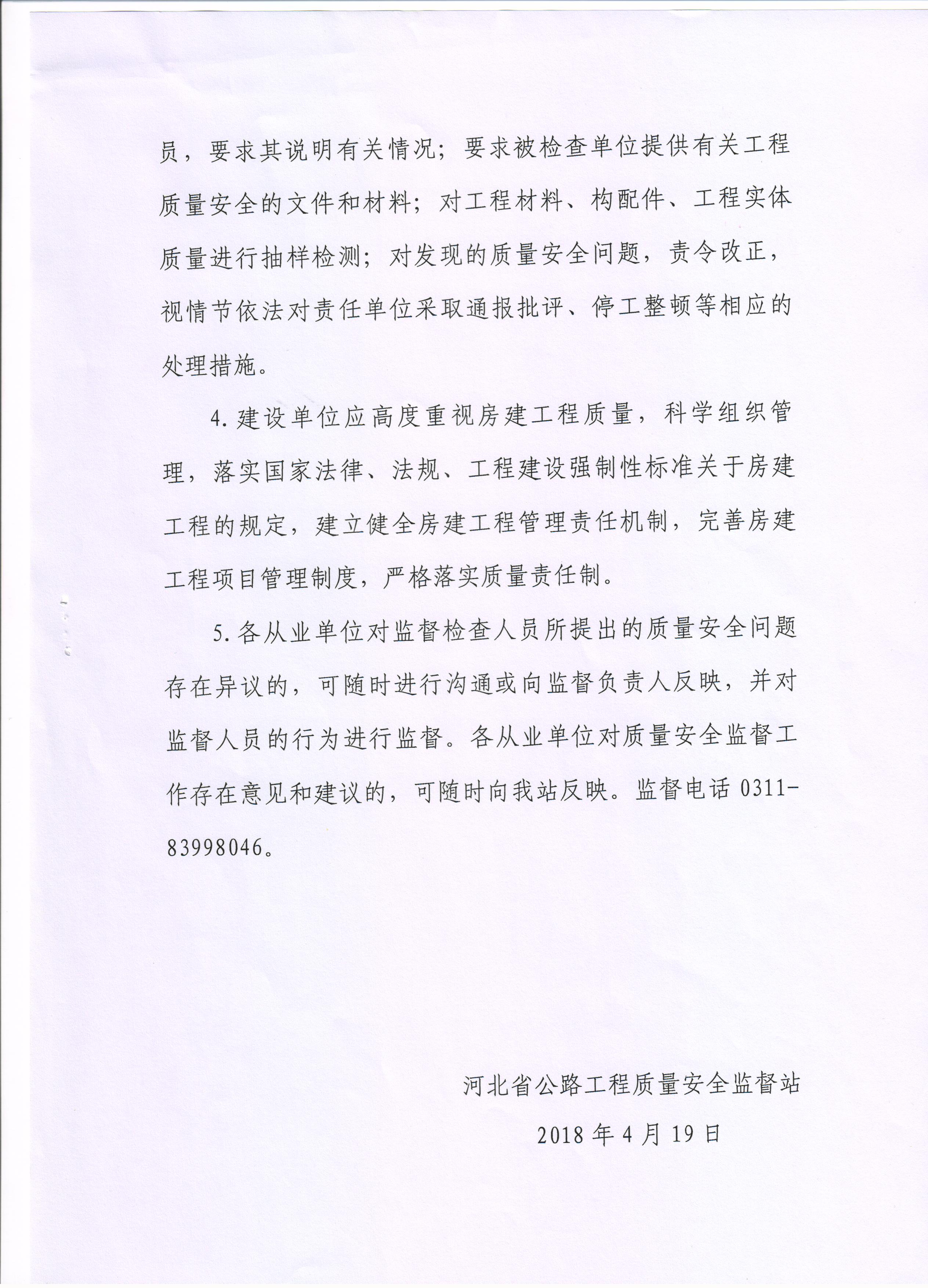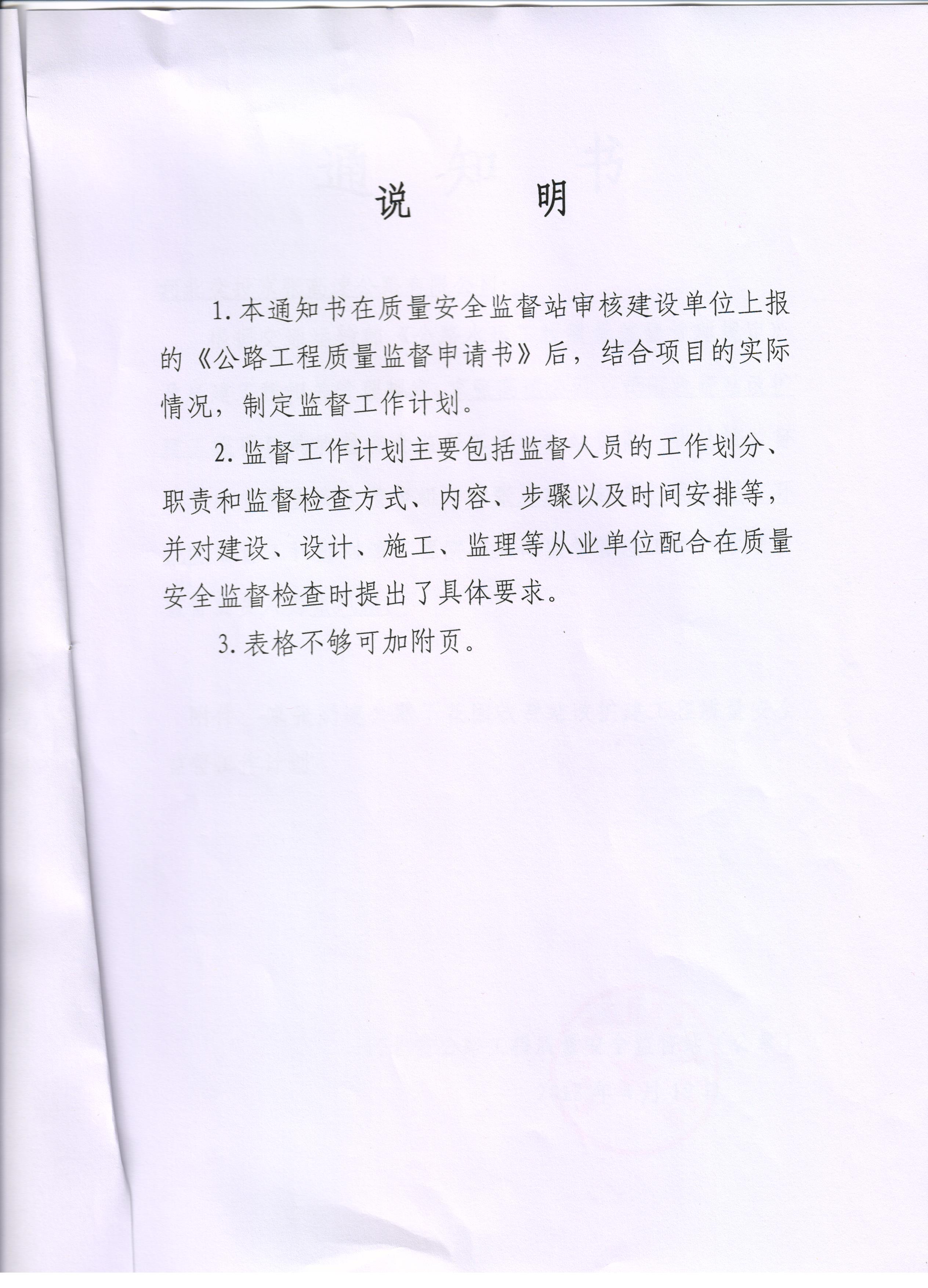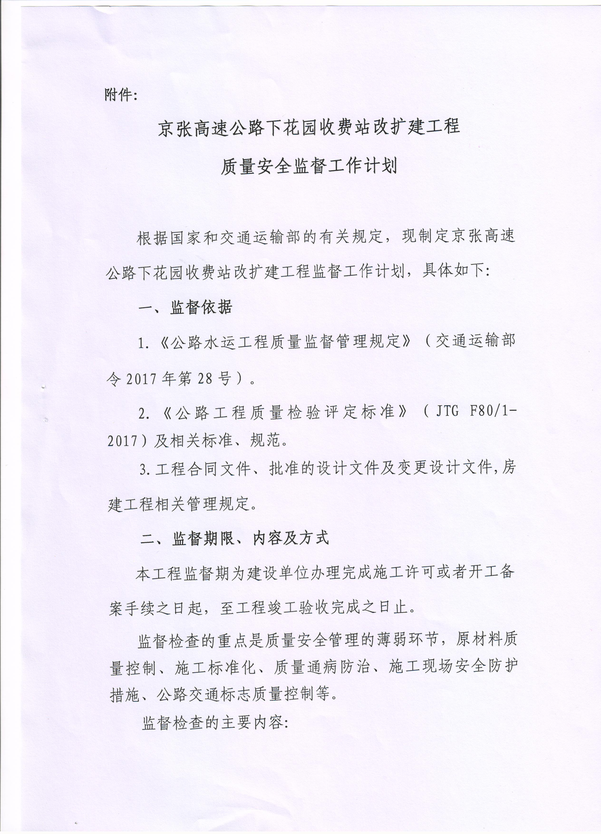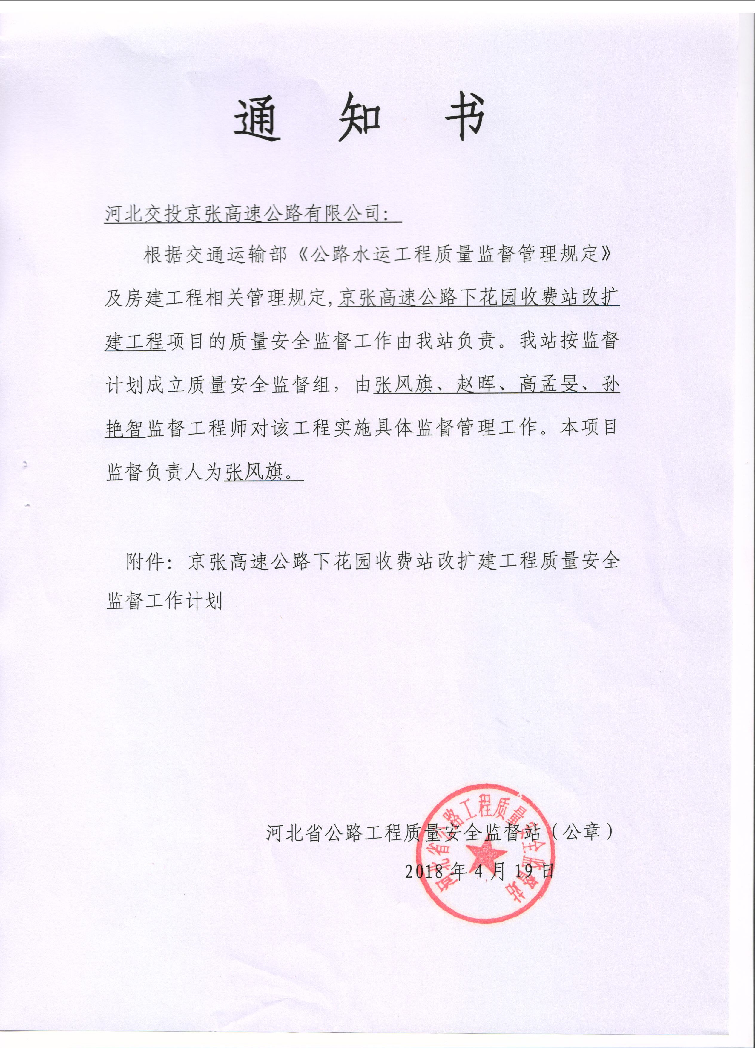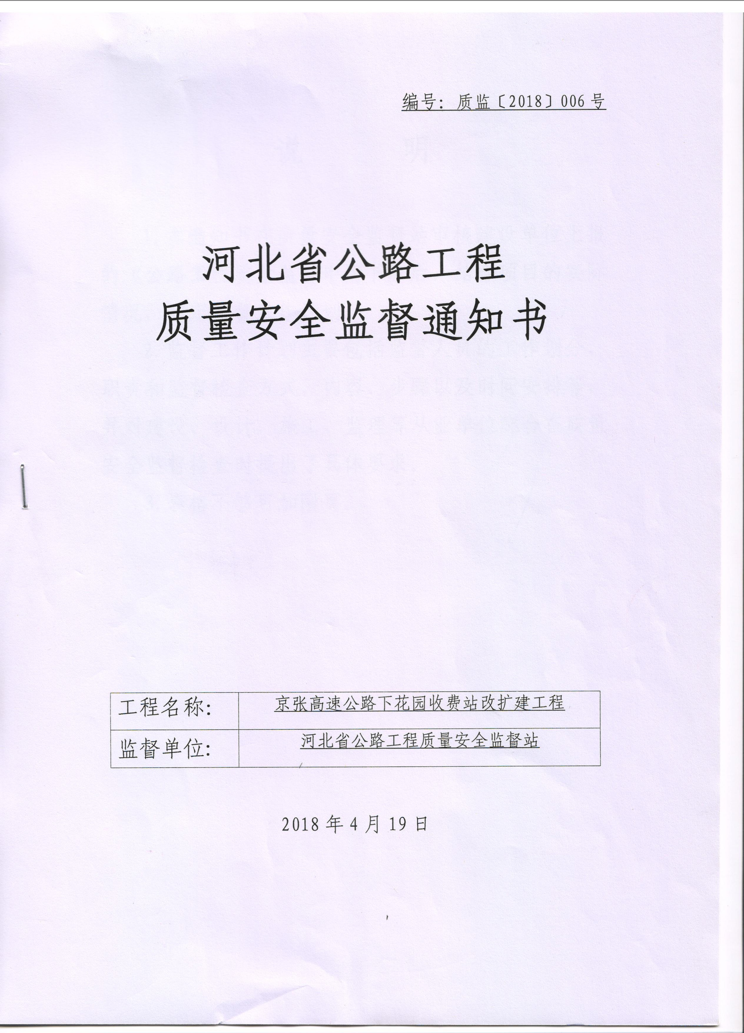京張高速公路下花園收費(fèi)站改擴(kuò)建工程質(zhì)量安全監(jiān)督通知書